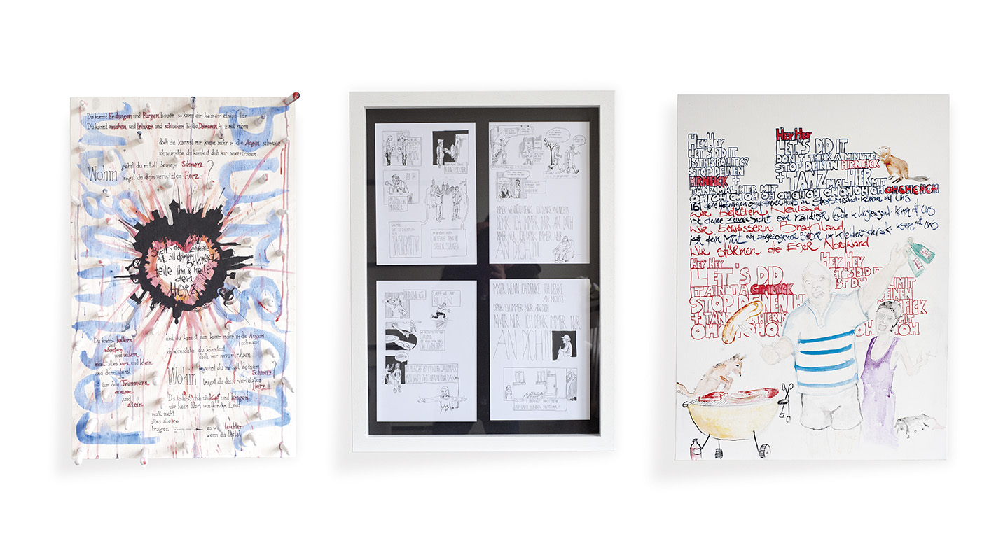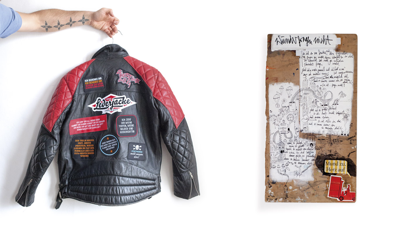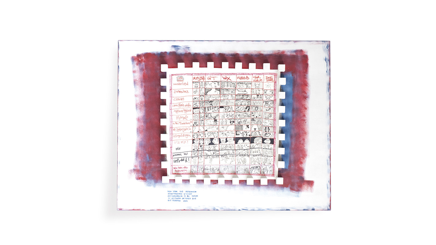 Im Cloudshillstudio zu Hamburg zimmerten, werkelten, modelierten, erschufen wir unser neues Album »New York, Rio, Rosenheim«. Die Studioräume wurden für uns zum Atelier unserer Klangskulptur. Und als dann Peter noch zu Rüde meinte »so, nun hätten wir den letzten Text aufgepinselt«, regte sich in uns die kreative Ader der freischaffenden Kunst. Jedes einzelne Lied vom Album soll sein eigenes kleines Kunstwerk bekommen, das sich mit dem Songtext, mit dem sich entwickelnden Gefühl, mit der bildlichen Metamorphose des klanglichen auseinandersetzt. Eine Liederschau. quasi eine künstlerische Umsetzung dessen, was uns musikalisch berührt, uns einnimmt, abfordert, uns Bilder malt – von New York über Rio bis nach Rosenheim. Ein bemalter Stuhl, eine divergierende Verkehrstafel, Dispersionsfarbenexplosionen auf Holz, zersägte Drumsticks, Tätowierungen in Öl, eine Lederjacke von einer sagenumwobenen Mopedgang, ein hundert Jahre alter Fensterrahmen und Wörter – alle! von »Hymne auf dich« bis zu »Wunder fragen nicht«. Eine »Liederschau« in Berlin, München, Hamburg und Passau.